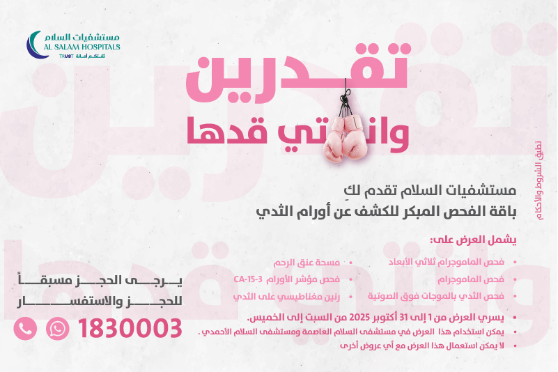 واعترافاً منا بأهمية التوعية، نقدم لكم خلال شهر أكتوبر باقة خاصة من الخدمات والفحوصات المبكرة للكشف عن سرطان الثدي، وذلك في إطار التزامنا بالصحة والوقاية ودعم التعافي المبكر.